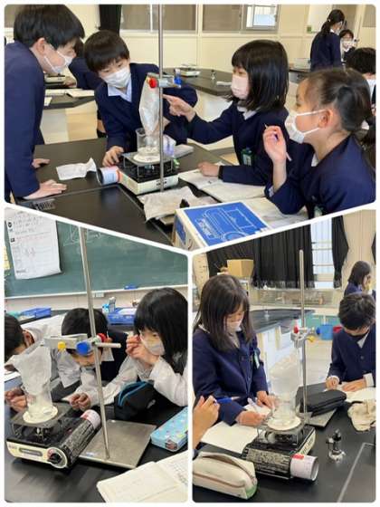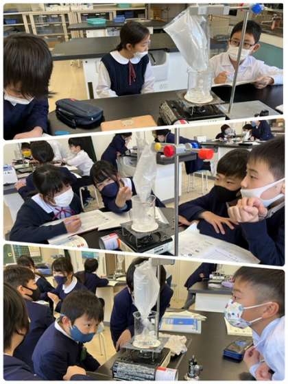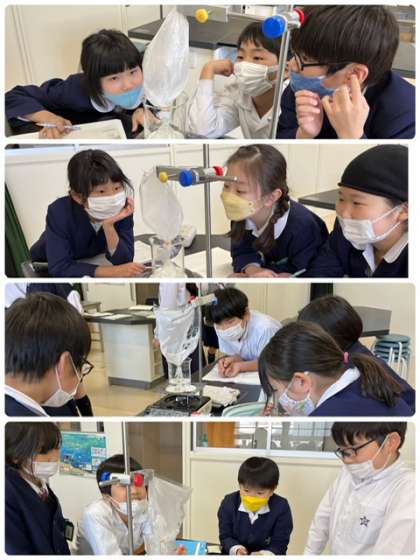理科の学習で、泡の正体について実験中です。みんなの真剣な眼差し!正体は分かったのでしょうか?