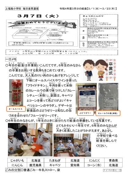 今日の給食は、6年生の卒業をお祝いする献立です。