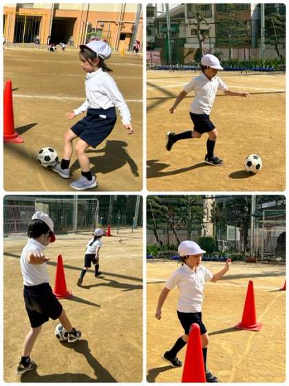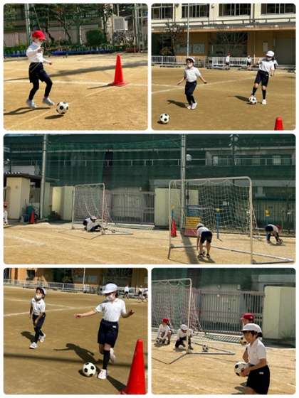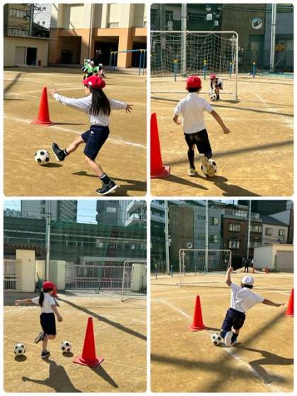 こちらは、同じボール蹴り遊びでもシュートをする学習です。ドリブルでボールを運びシュート!