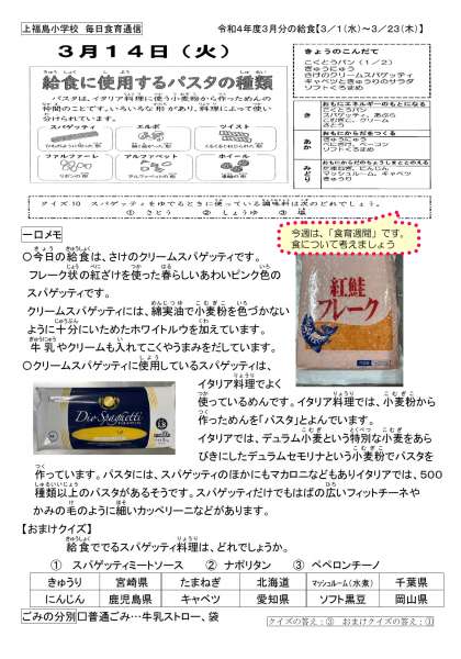 今日の給食は春らしい淡いピンク色をしたさけのクリームスパゲッティです。