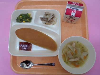 今日の給食は、「コッペパン(いちごジャム)、牛乳、豚肉のガーリック焼き、スープ、さんどまめとコーンのサラダ」です。1年生もがんばって食べていました。