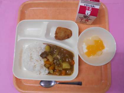 「カツカレーライス、牛乳、フルーツゼリー」です。
