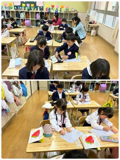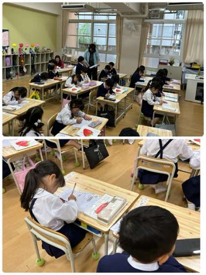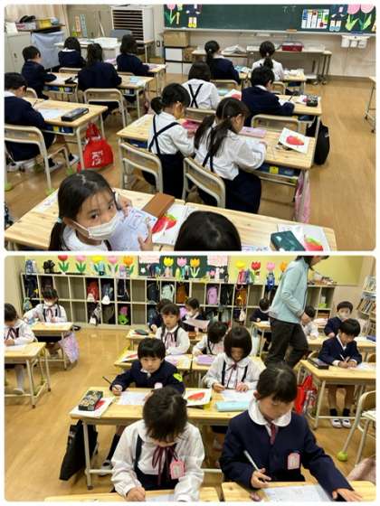 1年生も、学習がスタートしています。ひらがなのお手本を見て、丁寧に書いています。