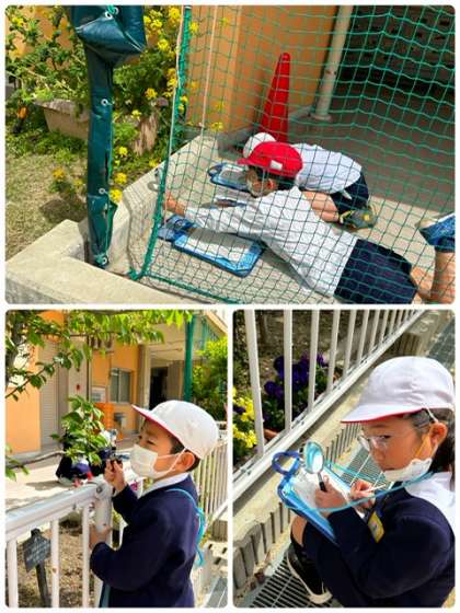 春の陽射しを浴びながら、校庭の木々を観察しています。気持ちいいーー