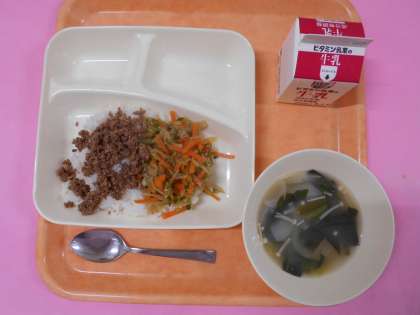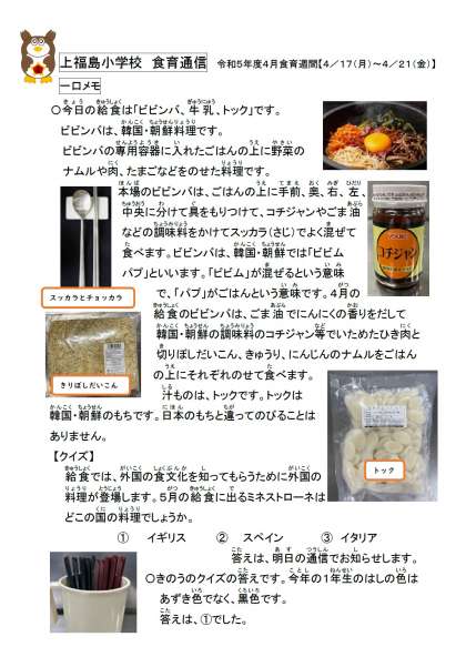 今日の給食は、韓国・朝鮮料理の「ビビンバ・トック」です。