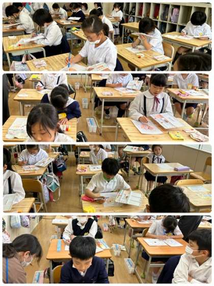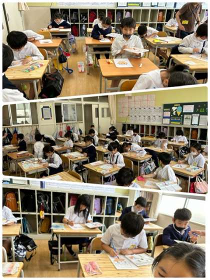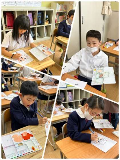 自画像を描いているようです。色の塗り方に特に気をつけて頑張っています。