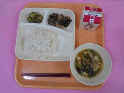 今日の給食は、「ごはん、牛乳、プルコギ、とうふとわかめのスープ、きゅうりの甘酢づけ」です。