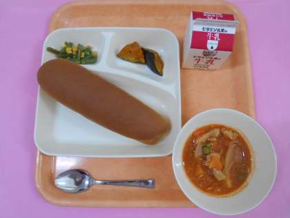 今日の給食は、「黒糖パン、牛乳、ケチャップ煮、さんどまめとコーンのソテー、焼きかぼちゃの甘みつかけ」です。