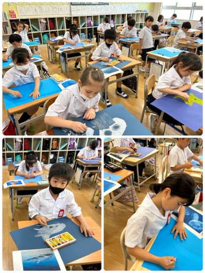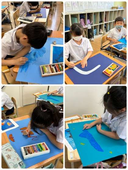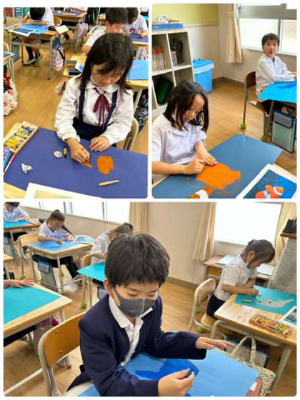 遠足の海遊館で見た、魚を絵に描いています。