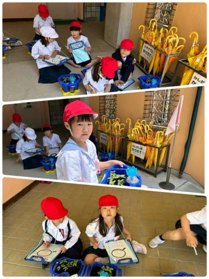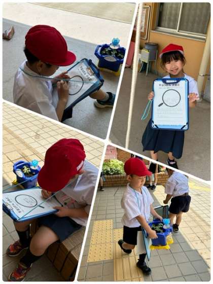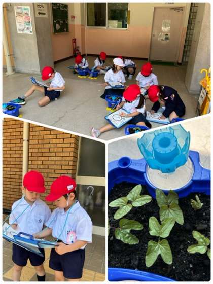 生活科で植えた、あさがおが発芽したようです。しっかり観察して、用紙に写しています。