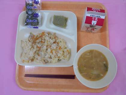 今日の給食は、かやくご飯、牛乳、みそ汁、まっ茶ういろうです。