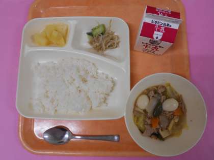 今日の給食は、ごはん、牛乳、八宝菜、チンゲンサイともやしのしょうがあえ、パインアップル(缶)です。