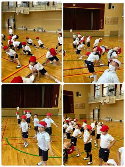 今日はあいにく雨だったので、講堂で合同の体育をしました。体づくりの運動や道具を使った運動をしました。