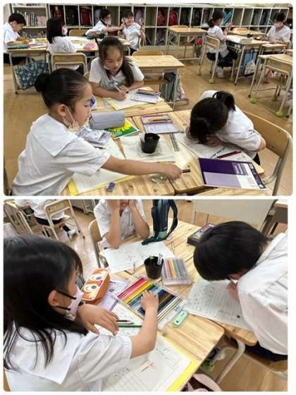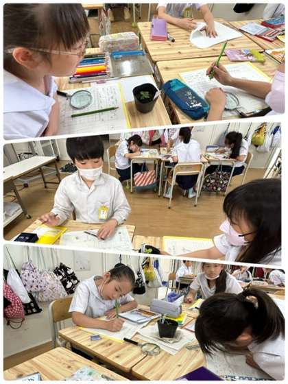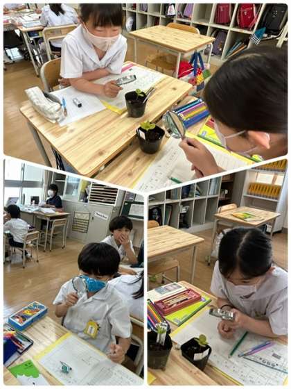 植物の観察をしています。小さなところ、細かなところまで見るために虫メガネを使って観察しています。