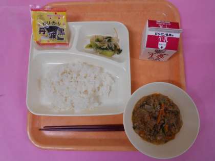 今日の給食は、ごはん、牛乳、マーボーはるさめ、チンゲンサイともやしの甘酢あえ、いり黒豆です。