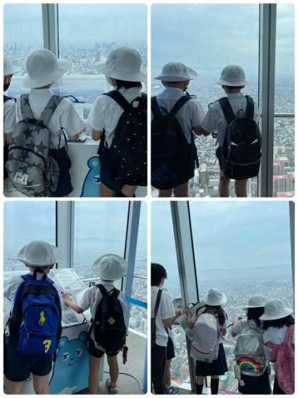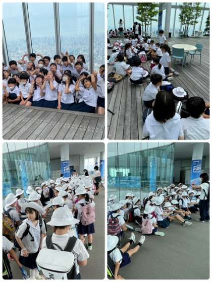 今日は、3年生が社会見学であべのハルカスと環状線一周を体験しました。ハルカスの上から見る景色は凄かったものの、下を見ると足がすくんだ人もいたようです。