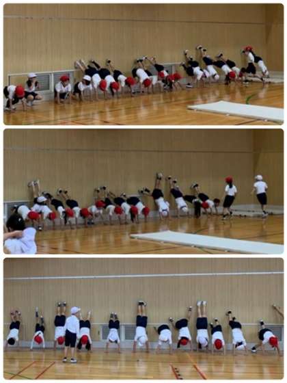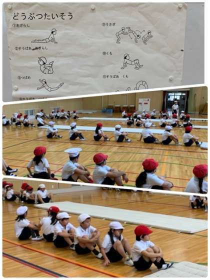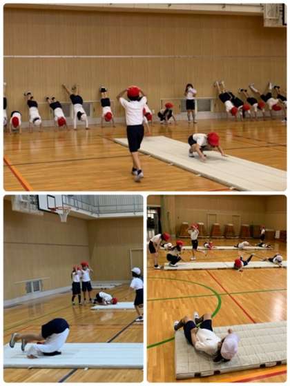 体育科のマット運動で、どうぶつたいそうをしました。いろいろな動物になりきって、マット運動を楽しみました!