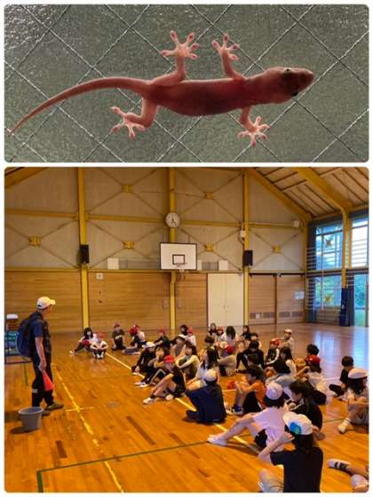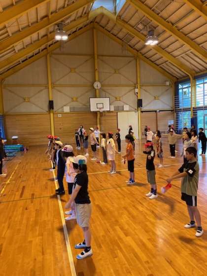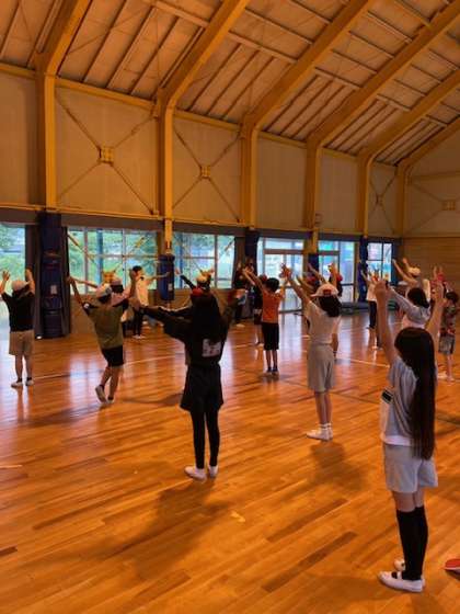 朝は雨のスタートです。講堂で朝の集い、昨日は保健室に行く子もなくみんなでラジオ体操しています。
