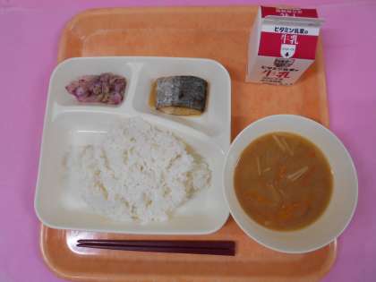 今日の給食は、ごはん、牛乳、さごしのつけ焼き、みそ汁、キャベツの赤じそあえです。