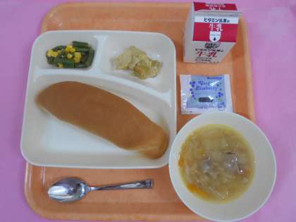 今日の給食は、コッペパン(ブルーベリージャム)、牛乳、鶏肉のカレー風味焼き、てぼ豆のスープ、さんどまめとコーンのサラダです。