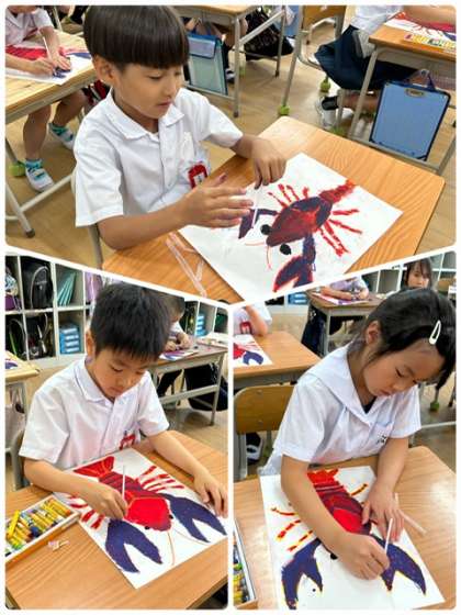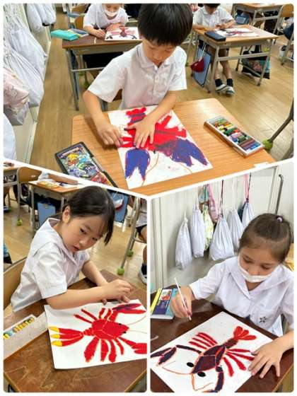生活科で育てているザリガニを図工科で描いています。迫力あるハサミがとても印象的な作品となりました。