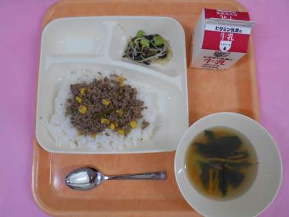 今日の給食は、3色丼、牛乳、3色スープ、3色酢のものです。