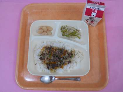 今日の給食は、牛丼、牛乳、もやしとピーマンのごまいため、大福豆の煮ものです。