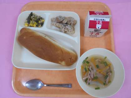 今日の給食は、おさつパン、牛乳、鶏肉のからあげ、とうがんの中華スープ、ツナとチンゲンサイのいためものです。