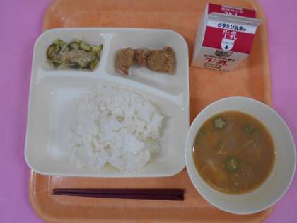 今日の給食は、ごはん、牛乳、豚肉のたつたあげ、みそ汁、切干しだいこんのゆずの香あえです。