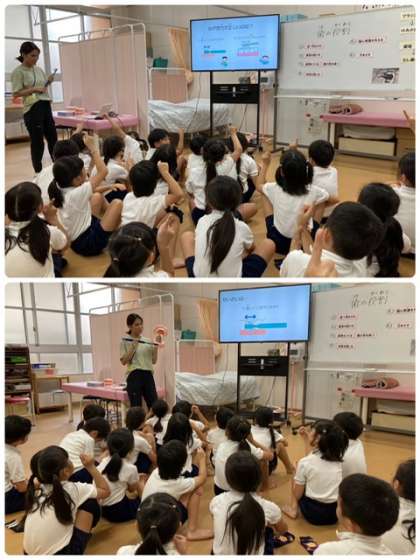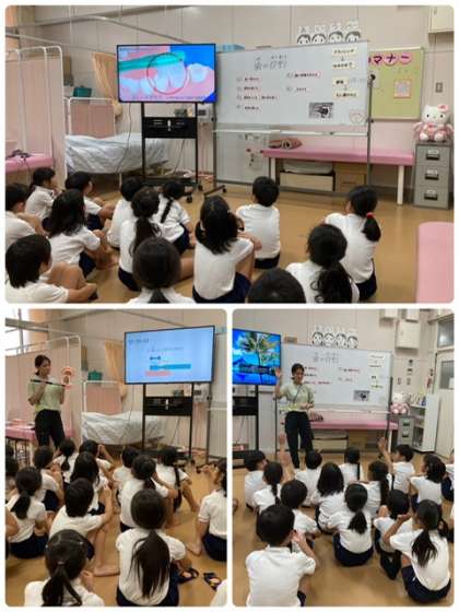 来週からスタートする給食後の歯磨きに向けて、発育測定前に指導を受けています。