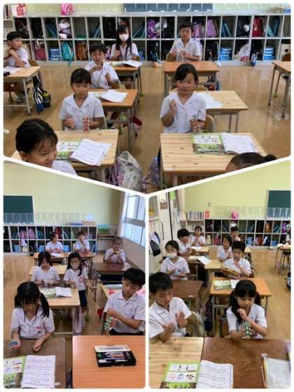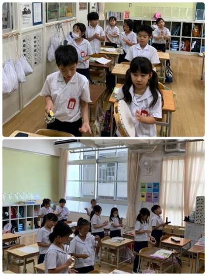 音楽の時間です。楽器を使って、楽しく演奏しています。