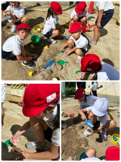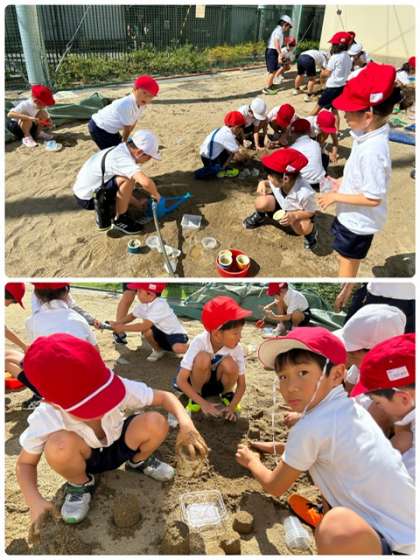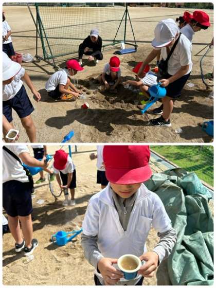 今日は、1年2組が砂場や砂山でどろんこ遊びをしました。