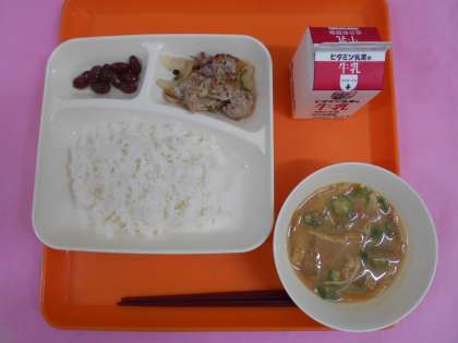 今日の給食はごはん、牛乳、豚肉の甘辛焼き、とうがんのみそ汁、金時豆の煮ものです。