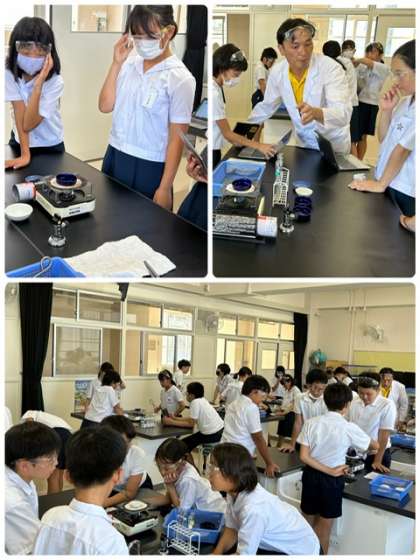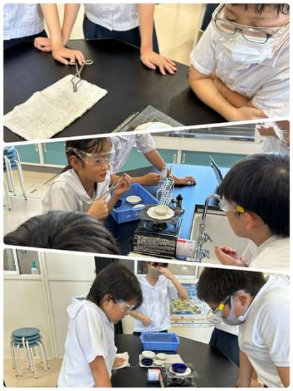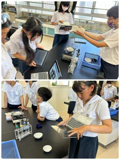 5つの水溶液を熱し、それぞれの違いを調べます。実験の様子を撮影したり、まとめを書いたりは、全てタブレットです。