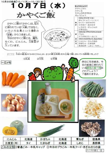 毎日食育通信:今日の給食に使われている緑色の食べ物は?