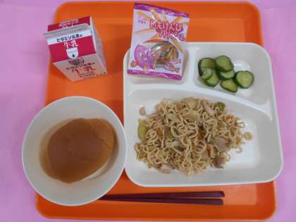 今日の給食は、黒糖パン(1/2)、牛乳、焼きそば、きゅうりのしょうがづけ、いもけんぴフィッシュです。