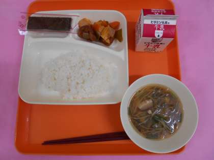 今日の給食は、ごはん、牛乳、酢豚、中華みそスープ、焼きのりです。