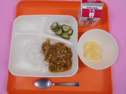 今日の給食は、大豆入りキーマカレーライス〔米粉〕、牛乳、きゅうりのサラダ、洋なし(カット缶)です。