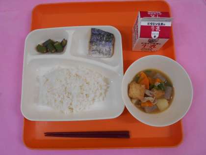 今日の給食は、ごはん、牛乳、さごしの塩焼き、含め煮、オクラのいためものです。