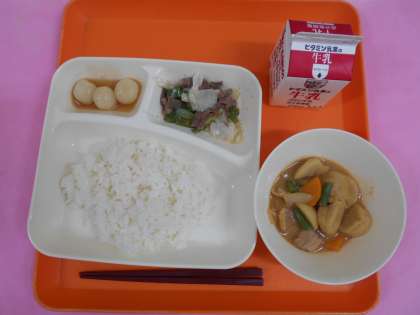 今日の給食は、ごはん、牛乳、一口がんもとさといものみそ煮、牛肉と野菜のいためもの、みたらしだんごです。