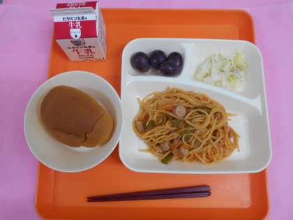 今日の給食は、黒糖パン1/2、牛乳、イタリアンスパゲッティ、キャベツのバジル風味サラダ、ぶどう(巨峰)です。
