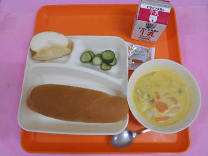 今日の給食は、コッペパン(アプリコットジャム)、牛乳、豆乳コーンクリームシチュー〔米粉)、きゅうりのバジル風味サラダ、りんごです。