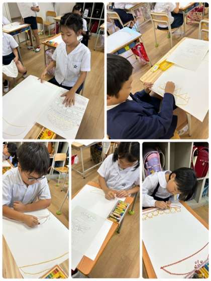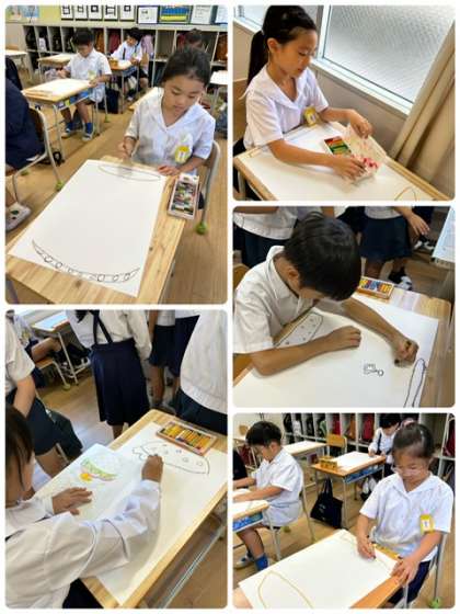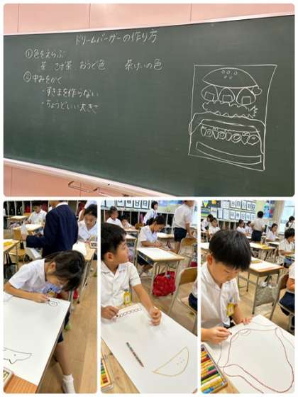 図工科でドリームバーガーを描きます。前回描いた下絵をもとに、クレパスで画用紙に描いて行きます。