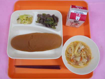 今日の給食は、黒糖パン、牛乳、牛肉の香味焼き、ほたて貝とトマトのスープスパゲッティ、はくさいのピクルスです。