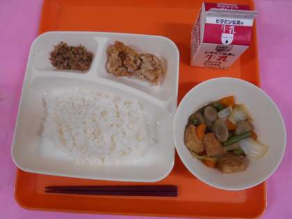 今日の給食は、ごはん、牛乳、鶏肉のたつたあげ、あつあげと野菜の煮もの、おかかなっ葉です。