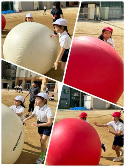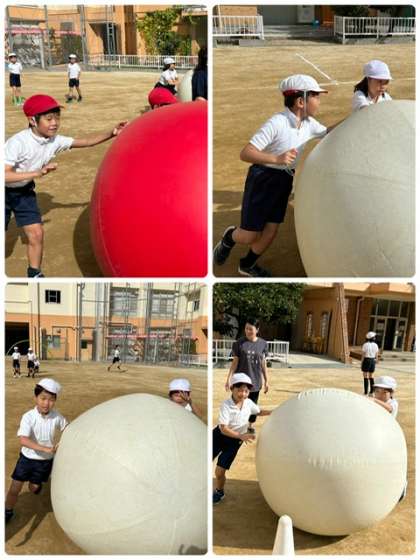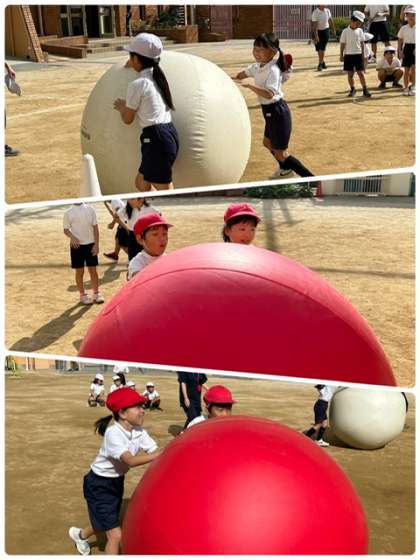 運動会に向けて、大玉転がしの練習です。