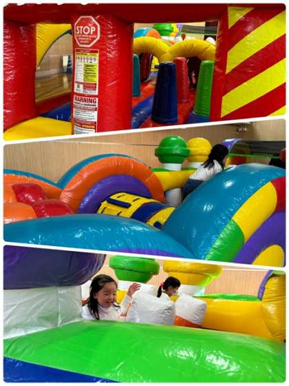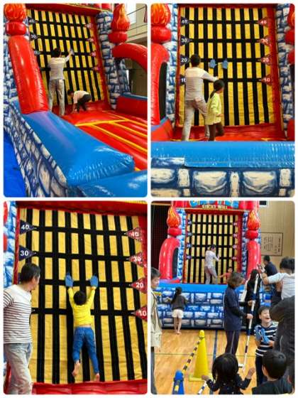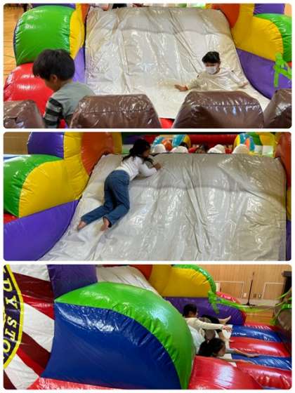 今日は講堂でPTA親子行事を開催しています。ふわふわアスレチックで楽しく遊んでいます。
