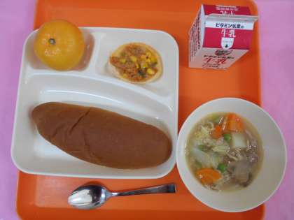 今日の給食は、黒糖パン、牛乳、豚肉と野菜のスープ煮、変わりピザ、みかんです。