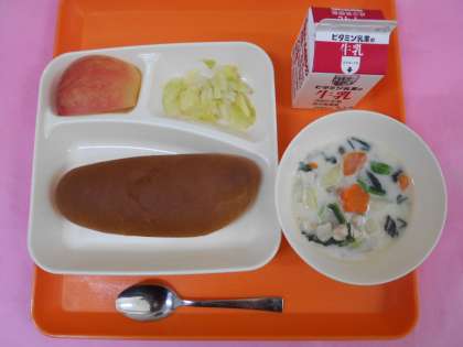 今日の給食は、黒糖パン、牛乳、きのこのクリームシチュー、キャベツのピクルス、りんごです。