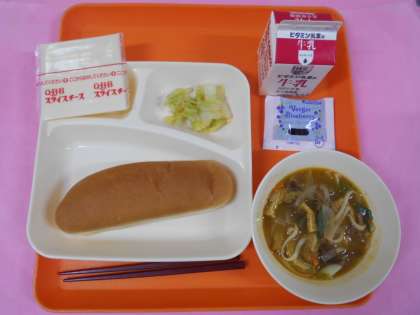 今日の給食は、コッペパン(ブルーベリージャム)、牛乳、カレーうどん、はくさいのおひたし、スライスチーズです。